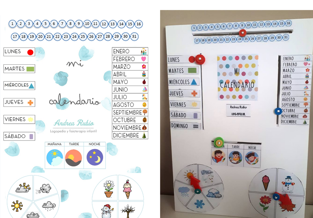 Por eso, todas nuestras sesiones comienzan orientándonos en el tiempo, así que hice este calendario tan visual y tan colorido que no deja a los peques indiferentes! Les encanta ser ellos los que mueven todas las manecillas!